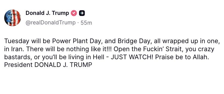 ट्रम्प यांनी त्याच्या सोशल मीडियावर एक पोस्ट लिहिली आहे. जिच्यामुळे संपूर्ण जगात खळबळ उडाली आहे.त्यांनी म्हटले आहे की मंगळवारी इराणमध्ये ‘पॉवर प्लांट डे’ आणि ‘ब्रिज डे’ असेल. म्हणजे ट्रम्प यांनी स्पष्ट शब्दात सांगितले आहे की इराणच्या वीज केंद्रांवर आणि पुलांवर हल्ले होतील. नंतर त्यांनी शिव्यांची लाखोली वाहात लिहीलंय की होर्मुझ उघडा, अन्यथा जहन्नुममध्ये राहाल. केवळ पाहात राहा. आणखी पुढे लिहिलंय की अल्लाची प्रशंसा करा.’