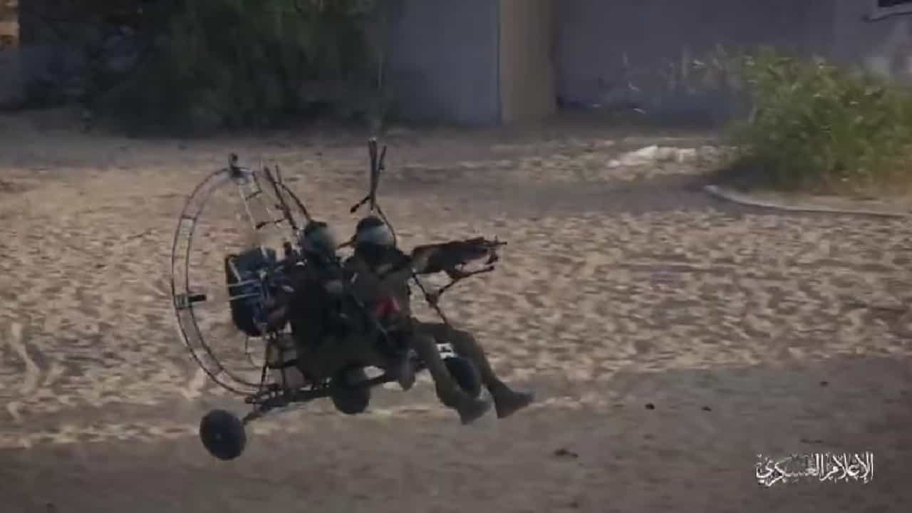 एका मोटार असलेल्या पॅराशूटचा वापर हमासच्या अतिरेक्यांनी केला. त्यामुळे डोंगर न चढता किंवा विमानांचा वापर न करता ते आरामात सीमा ओलांडून आले. इंजिन पॅराशूटला दर ताशी 56 किमी वेग देते. ते तीन आकाशात 5000 मीटरपर्यंत उडू शकतात. सोशल मिडीयात याचे व्हिडीओ शेअर केले आहेत. त्यात एका पॅराशूटमध्ये एक किंवा दोन अतिरेकी उड्डाण घेताना दिसत आहेत. ते वरुन गोळीबार करतानाही दिसत आहेत. हमासने त्यास सक्र स्क्वॉड्रन असे नाव दिले आहे. परंतू साध्या डोळ्यांनी दिसणारे आणि मोबाईलमधून ज्यांचे चित्रीकरण सहज केले ते पॅराग्लायडर इस्राइलच्या सैन्याला कसे दिसले नाहीत याचा खुलासा अद्याप इस्राइलने केलेला नाही.