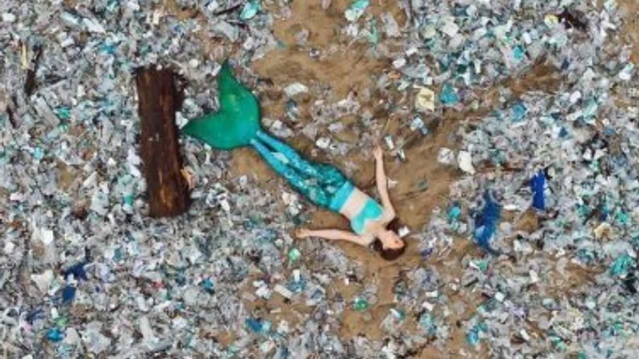 (instagram user highlights the sad reality of marine pollution share mermaid photo on bali beach)