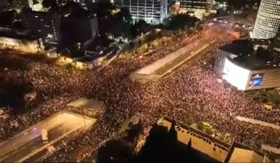 Wow. Aerial video of massive protest in Tel Aviv, Israel tonight of nearly 300,000 people, demanding a ceasefire hours after bodies of 6 hostages were retrieved from Gaza tunnel. Largest rally since war: pic.twitter.com/2KtqWUk7ef