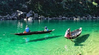 ही भारतातील सर्वात स्वच्छ नदी मानली जाते, जी दिसायला काचेसारखी आहे. त्यावर चालणाऱ्या बोटी हवेत तरंगताना दिसत आहेत. (फोटो क्रेडिट- timetraveller_official)