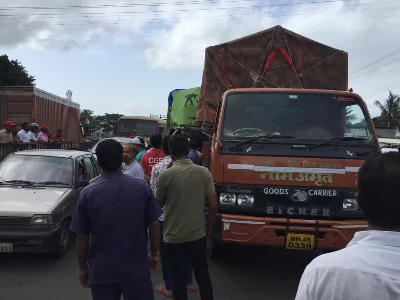 मुंबईहून कोल्हापूरच्या पूरग्रस्त भागांकडे जीवनावश्यक वस्तू घेऊन जात असताना पुणे बंगळूर राष्ट्रीय महामार्गावरील कराडजवळ अपघात झाला.