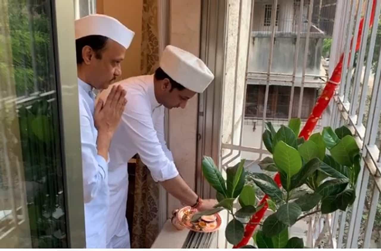 मुंबई : उपमुख्यमंत्री अजित पवार यांनी मुंबईतील निवासस्थानी अत्यंत साधेपणाने गुढी उभारुन गुढीपाडवा साजरा केला. पुत्र पार्थ पवार यांच्या सोबतीने अजित पवारांनी गुढीची पूजा केली. (Ajit Pawar Gudhipadawa Celebration)