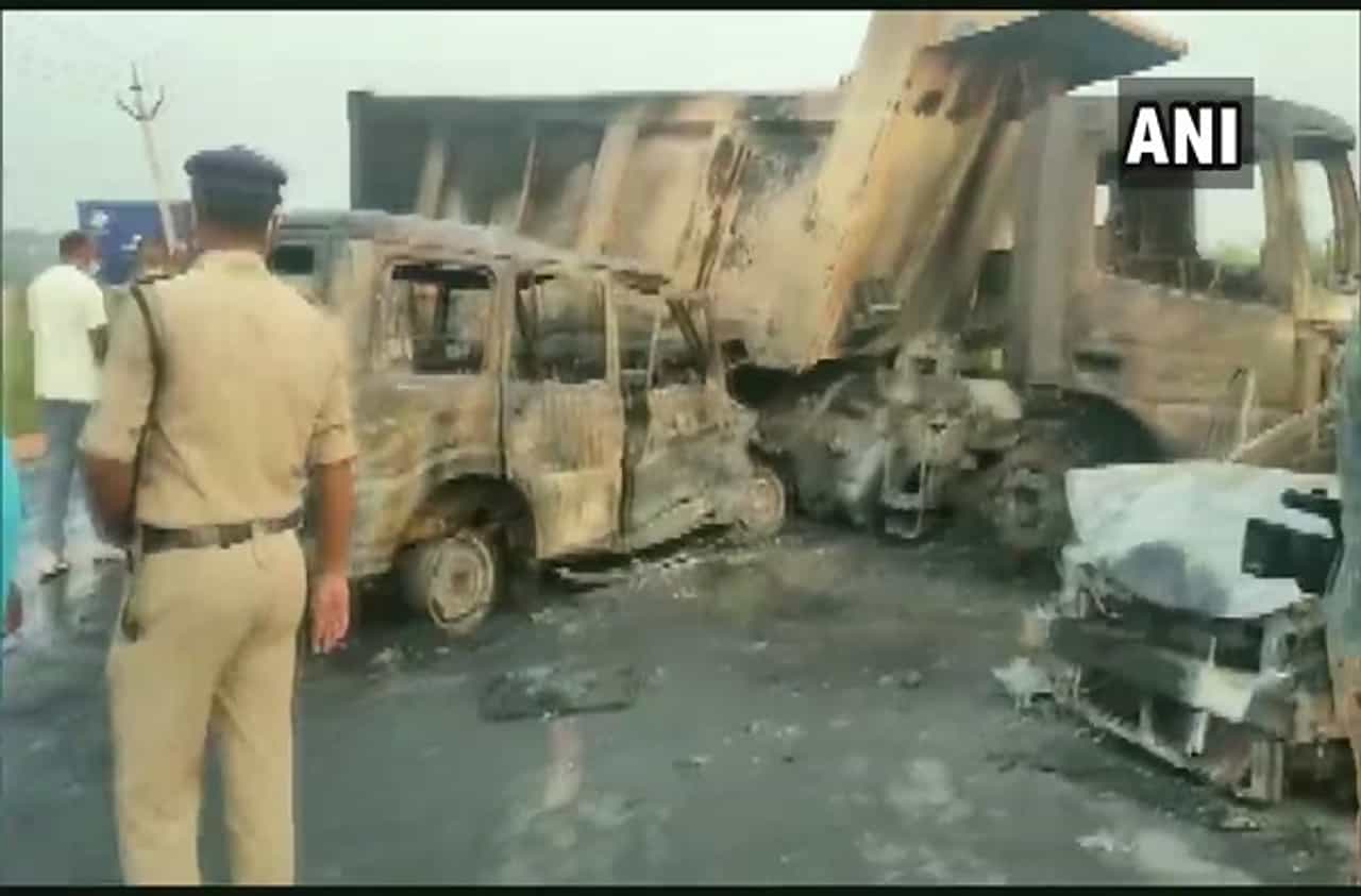 Andhra Pradesh: Five persons died in a road accident as two cars hit a tipper truck carrying diesel at around 3 am today near Kadapa airport. While four died on the spot after vehicles caught fire, one person succumbed to injuries undergoing treatment at RIMS, Kadapa pic.twitter.com/zbT8cIQzmA