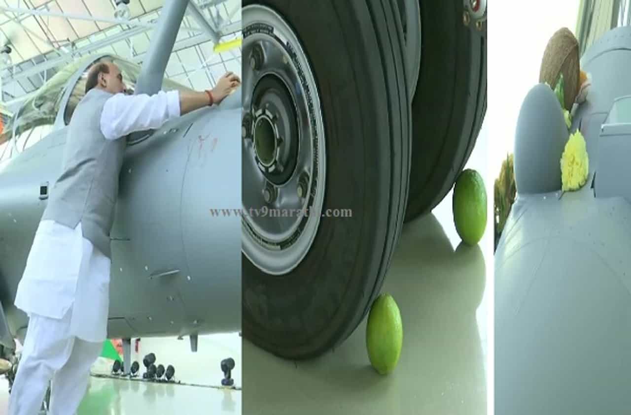 दसऱ्याला शस्त्रपूजेची परंपरा असल्यामुळे राजनाथ सिंह यांनी लढाऊ विमानाची पूजा केली. राजनाथ सिंह यांनी फ्रान्समध्येही भारतीय परंपरा दाखवत, राफेल विमानाच्या चाकाखाली लिंबू आणि विमानावर ओम काढलं. राफेल विमानाची पूजा करुन, त्यानंतर राजनाथ सिंह यानी त्यातून भरारी घेतली.