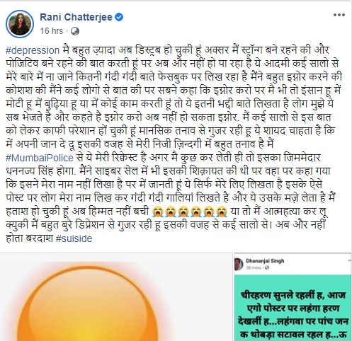 “याबद्दल मी सायबर सेलमध्येही तक्रार केली होती, पण त्यांनी असे म्हटले होते की याने माझे नाव लिहिले नाही. परंतु मला माहित आहे की ते फक्त माझ्यासाठीच लिहिले जाते. कारण अशा पोस्टवर इतर लोक माझे नाव लिहितात आणि घाणेरड्या शिव्या देतात. आणि हा त्याचा आनंद घेतो. मी हतबल झाले आहे, आता माझ्यात हिम्मत नाही. एकतर मी आत्महत्या केली पाहिजे. कारण मी बर्याच वर्षांपासून खूप वाईट मानसिक अवस्थेतून जात आहे. आणखी सहन होत नाही. #सुसाईड” असे राणीने यात लिहिले आहे.