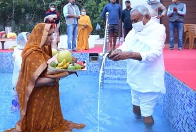 सोशल डिस्टन्सिंगमुळे छटपूजा सार्वजनिक ठिकाणी करू नये, असे आवाहन प्रशासनाकडून लोकांना करण्यात आहे. त्यामुळे नितीश कुमार यांनीही आपल्या निवासस्थानातील स्विमिंग पूलमध्ये सूर्याला अर्घ्य वाहून छटपूजा केली.