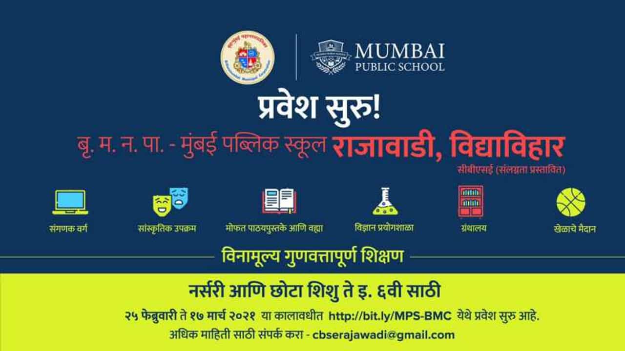 हरियाली व्हिलेज महानगरपालिका शाळा, विक्रोळी , राजावाडी महानगरपालिका शाळा, विद्याविहार आणि अझीझ बाग महानगरपालिका शाळा, चेंबूर या तीन शाळांमध्ये प्रवेशासाठी नोंदणी सुरु झाली आहे. https://portal.mcgm.gov.in/irj/portal/anonymous/qlMumPublic12 या वेबसाईटवर प्रवेश अर्ज भरता येणार आहेत. प्रवेश अर्ज नोंदवण्यसाठी 17 मार्चपर्यंत अर्ज भरता येणार आहेत.