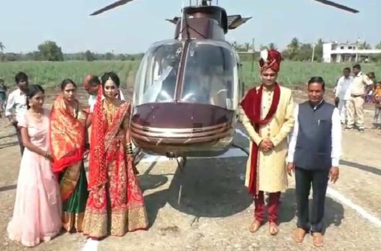 मुलीच्या इच्छेखातर एका शेतकऱ्याने मुलीच्या लग्नाची पाठवणी थेट हेलिकॉप्टरने (bridal farewell with helicopter) केली.