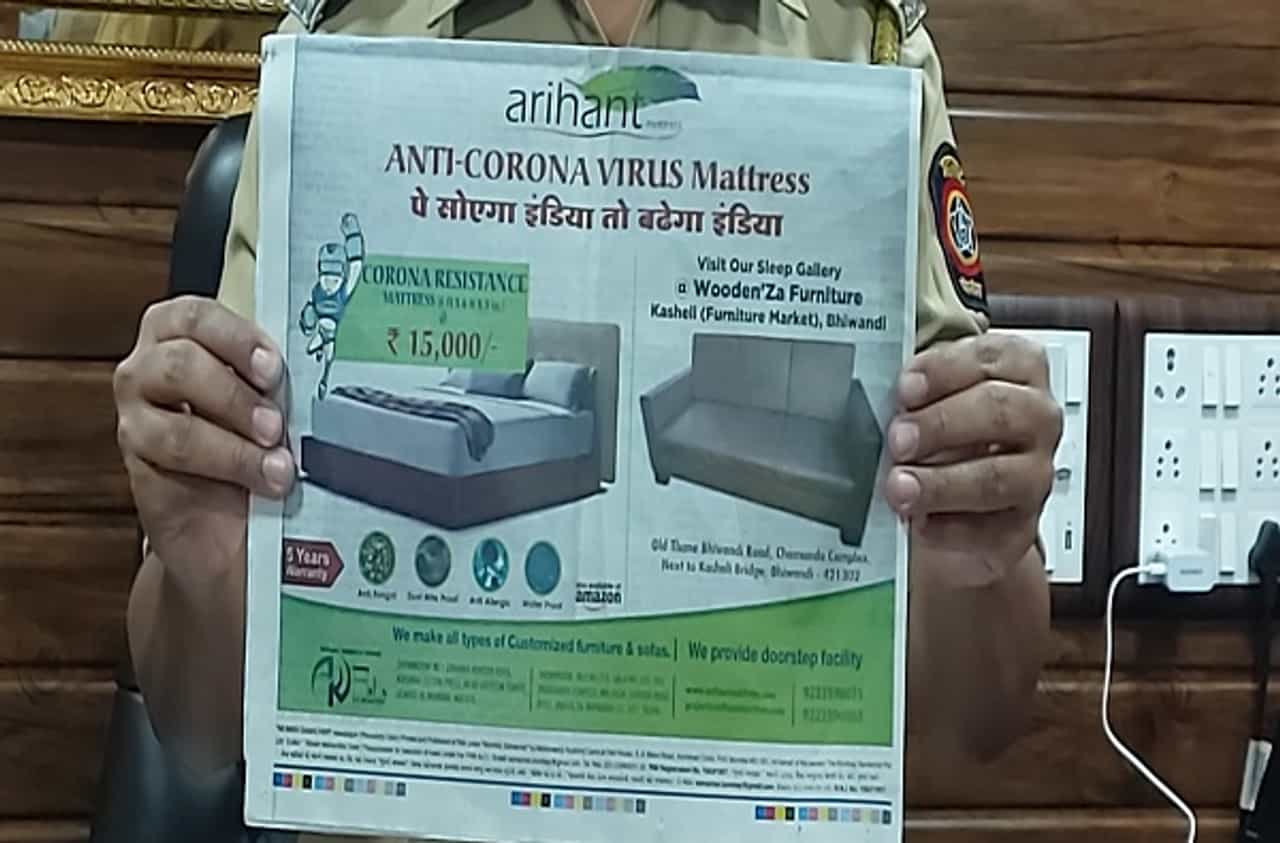 या विक्रेत्याचे भिवंडीच्या कशेळी आणि वळ या भागात गादीचं दुकाण आहे. त्याच्या दुकाणाचे नाव ‘अरिहंत मेट्रेस’ असं आहे. या विक्रेत्याने ‘अँटी करोना व्हायरस मेट्रेस’ ही 15 हजार रुपयांची गादी विक्रीस आणली. त्यावर झोपल्यास करोनाचा प्रादुर्भाव होत नाही, अशी फसवी जाहिरात ‘मुंबई समाचार’ या गुजराती दैनिकात 13 मार्चच्या अंकात प्रकाशित केली. यावर स्थानिक प्राथमिक आरोग्य केंद्राचे वैद्यकीय अधिकारी डॉ. बाळासाहेब डावखरे यांनी आक्षेप घेत पोलिसात तक्रार केली.