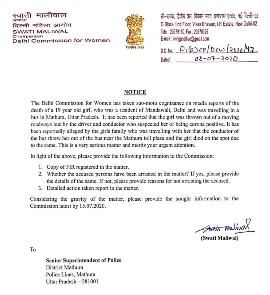 या घटनेप्रकरणी दिल्ली महिला आयोगाने उत्तर प्रदेश पोलिसांना नोटीस पाठवली आहे. मृत मुलगी पूर्व दिल्लीतील मंडालवी भागात वास्तव्यास होती. तिची प्रकृती बरी नव्हती. मात्र, तिची कोराना चाचणी केली असल्याची माहिती तिच्या कुटुंबियांनी दिली. त्यामध्ये तिचा रिपोर्ट कोरोना निगेटिव्ह आला होता. त्यानंतरच ती बसने प्रवास करत होती. यावेळी तिच्यासोबत कुटुंबातील एक व्यक्तीदेखील होती, अशी माहिती तिच्या कुटुंबियांनी दिली.
