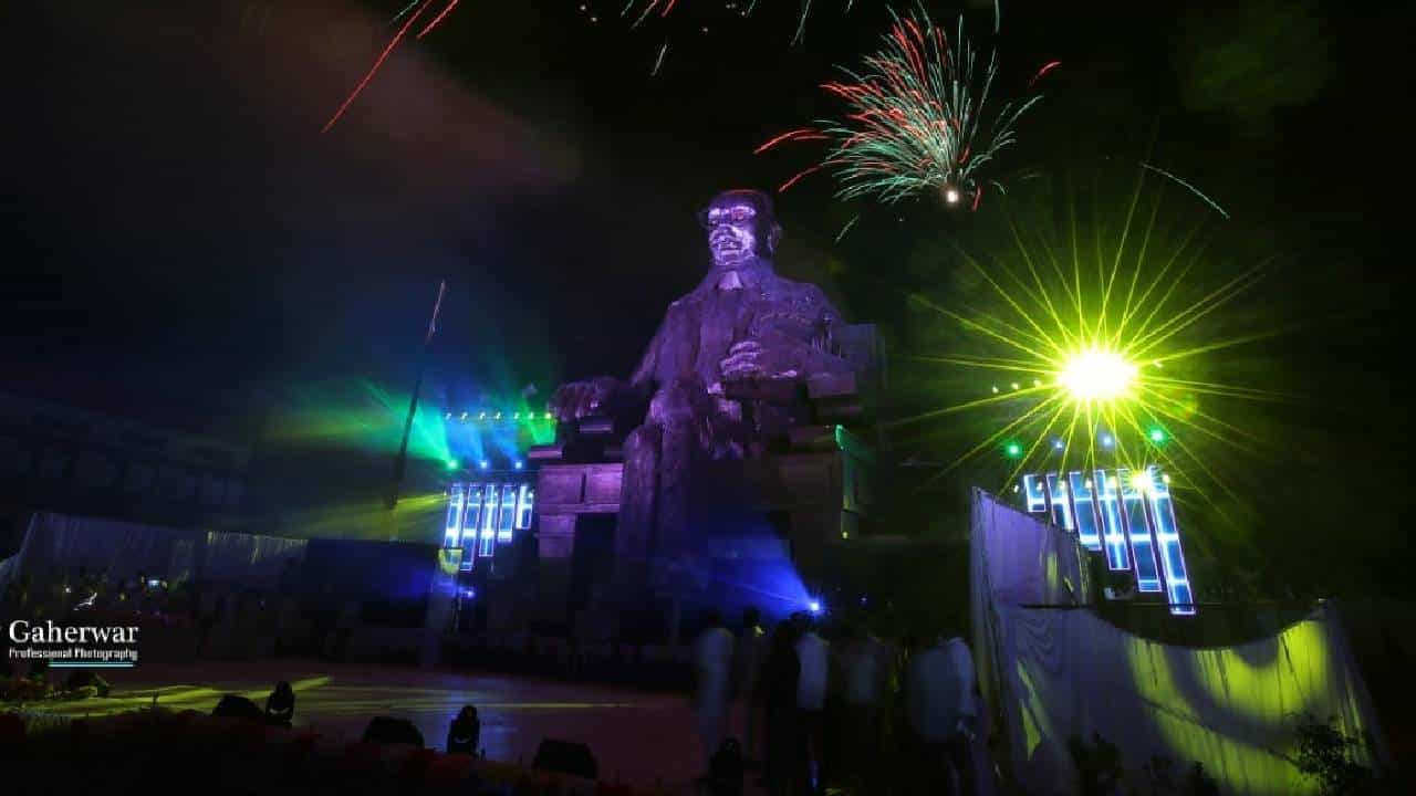 -या पुतळ्याच्या लोकार्पण कार्यक्रमादरम्यान लेझर शोचे देखील आयोजन करण्यात आले होते. शेकडो आंबेडकर अनुयायांच्या उपस्थितीत लोकार्पण सोहळा संपन्न झाला. ( फोटो क्रेडिट - देवेंद्र फडणवीस फेसबुक वॉल )