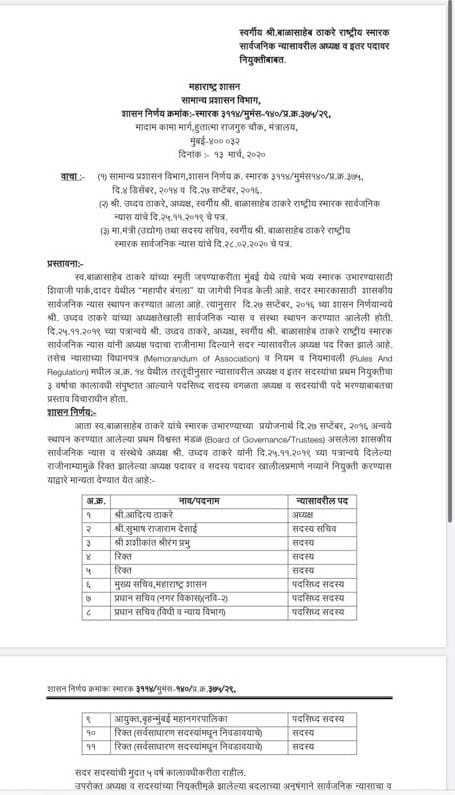 “25 नोव्हेंबर 2019 च्या पत्रानुसार उद्धव ठाकरे यांनी बाळासाहेब ठाकरे राष्ट्रीय स्मारक सार्वजनिक न्यासच्या अध्यक्षपदाचा राजीनामा दिला होता. त्यामुळे हे अध्यक्षपद रिक्त झाले होते. त्यानंतर 13 मार्च 2020 रोजी या अध्यक्षपदी पर्यावरणमंत्री आदित्य ठाकरे यांची नियुक्ती करण्यात आली आहे,” असे या निर्णयात नमूद केलं आहे.