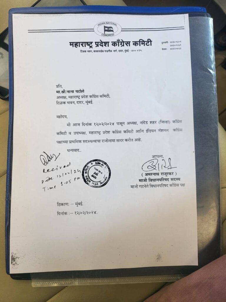 मी आज दिनांक 12/02/2024 पासून अध्यक्ष, नांदेड शहर ( जिल्हा) काँग्रेस कमिटी व उपाध्यक्ष, महाराष्ट्र प्रदे काँग्रेस कमिटी आणि इंडियन नॅशनल काँग्रेस पक्षाच्या प्राथमिक सदस्यत्वाचा राजीनामा सादर करीत आहे. धन्यवाद. असं अमरनाथ राजूरकर यांनी त्यांच्या पत्रात नमूद करण्यात आलं आहे.