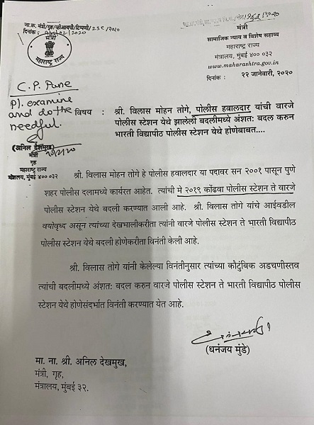 विलास तोगेला वारजे पोलीस ठाण्यातून भारती पोलीस ठाण्यात बदली हवी होती. यासाठी त्याने जानेवारी महिन्यात 3 मंत्र्यांचे शिफारस पत्र पोलीस आयुक्तांना सादर केले होते. या शिफारस पत्रात आई, वडील आजारी असून उपचारासाठी वेळ देणे आवश्यक असल्याचं म्हटलं होतं. घरापासून वारजे पोलीस ठाणे 11 किलोमीटर आहे. त्यामुळे भारती पोलीस ठाण्यात बदली करावी, अशी मागणी या अर्जात केली होती. या शिफारस पत्रात तोगेनं कोंढवा पोलीस ठाण्यात 30 ते 35 गंभीर गुन्हे उघडकीस आणल्याचं म्हटलं होतं. तसेच या प्रकरणी बक्षीस देखील मिळाल्याचं नमूद करत मे 2019 रोजी वारजे माळवाडी पोलीस स्टेशनला बदली केल्याचा उल्लेख आहे.