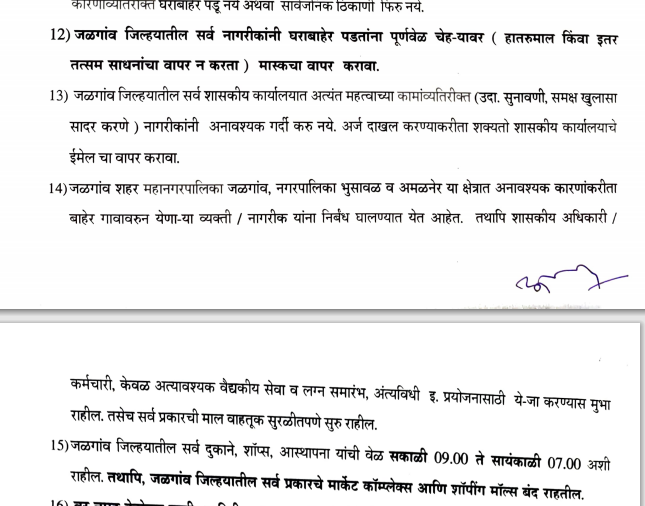 जळगाव जिल्हातील सर्व नागरिकांनी घराबाहेर पडताना पूर्णवेळ चेहऱ्यावर (हातरुमाल किंवा तत्सम साधनांचा वापर न करता) मास्कचा वापर करावा. याशिवाय भाजी विक्रेते आणि फळ विक्रेते यांना ठरवून दिलेल्या जागीच विक्री करता येईल, असं जिल्हाधिकाऱ्यांकडून सांगण्यात आलं आहे.