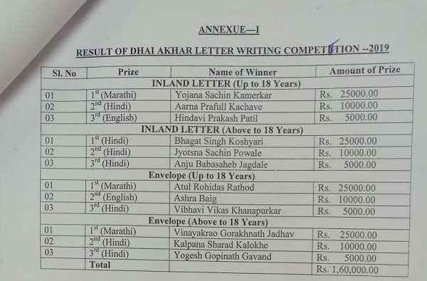 “प्रिय बापू आप अमर है” या विषयावरील पत्रलेखन स्पर्धेत लिफाफा आणि आंतरदेशीय पत्र अशा दोन भागात ही स्पर्धा होती. यात स्पर्धेत 80 हजार पेक्षा जास्त स्पर्धकांनी भाग घेतला होता, अशा माहिती डाकसेवा विभागाच्या अधिकाऱ्यांनी दिली.
