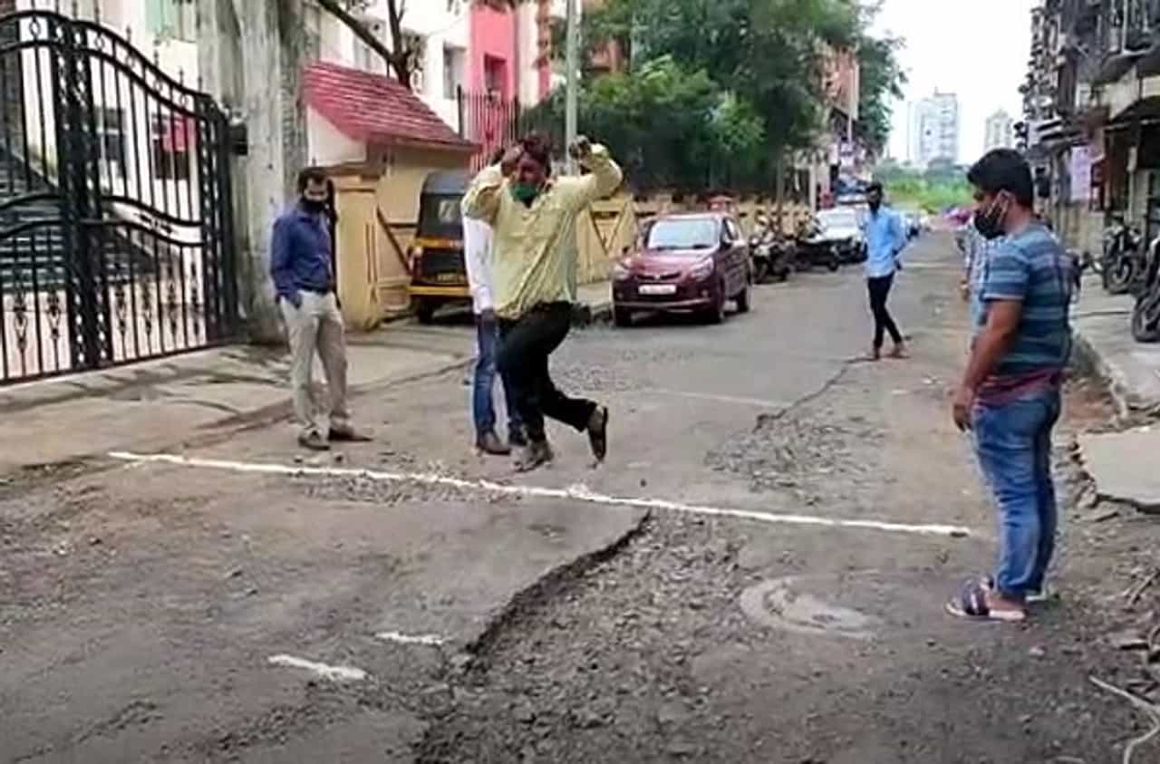 खड्ड्यांमधून "लांब उडीची" स्पर्धा घेऊन मनसेने आपला निषेध नोंदवला.