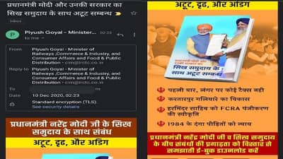 IRCTCकडून पाठवण्यात आलेल्या ई-मेलमध्ये पंतप्रधान नरेंद्र मोदी यांच्या सरकारने शिख समाजासाठी केलेल्या 13 कामांची माहिती देण्यात आली आहे. 8 ते 12 डिसेंबरदरम्यान हे ई-मेल पाठवण्यात आले आहेत. अधिकाऱ्यांनी दिलेल्या माहितीनुसार IRCTCने आपल्या ग्राहकांना एक 47 पानी पुस्तिका पाठवली आहे. ‘पंतप्रधान मोदी आणि त्यांच्या सरकारचे शिख समाजाशी विशेष संबंध’ असं या पुस्तिकेचं नाव आहे. ही पुस्तिका केंद्र सरकारच्या जनसंपर्क विभागाकडून पाठवण्यात आली आहे. कायद्यांबाबत लोकांमध्ये जागृती निर्माण करण्याबरोबरच त्यांच्या मनातील शंका दूर करणे हा या पुस्तिकेचा उद्देश आहे. ही पुस्तिका इंग्रजी, हिंदी आणि पंजाबी अशा तीन भाषांमध्ये आहे. त्यावर पंतप्रधान नरेंद्र मोदी यांचा फोटोदेखील आहे.