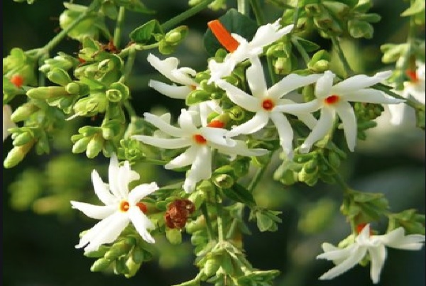 पारिजातक किंवा प्राजक्ताचे झाड. हा वृक्ष दिसायला अत्यंत लोभस. प्राजक्ताची फुले भगवान श्रीकृष्ण यांच्या पूजेमध्ये वाहिली जातात. या मोहक आणि सुवासिक फुलांना ‘हरसिंगार’ (हरीचा शृंगार) असेही म्हणतात. हिंदू धर्मात हे झाड फार महत्वाचे मानले जाते. एखाद्या व्यक्तीला आलेला थकवा केवळ पारिजातकाला स्पर्श करुन नाहीसा होतो, अशीही धारणा आहे.