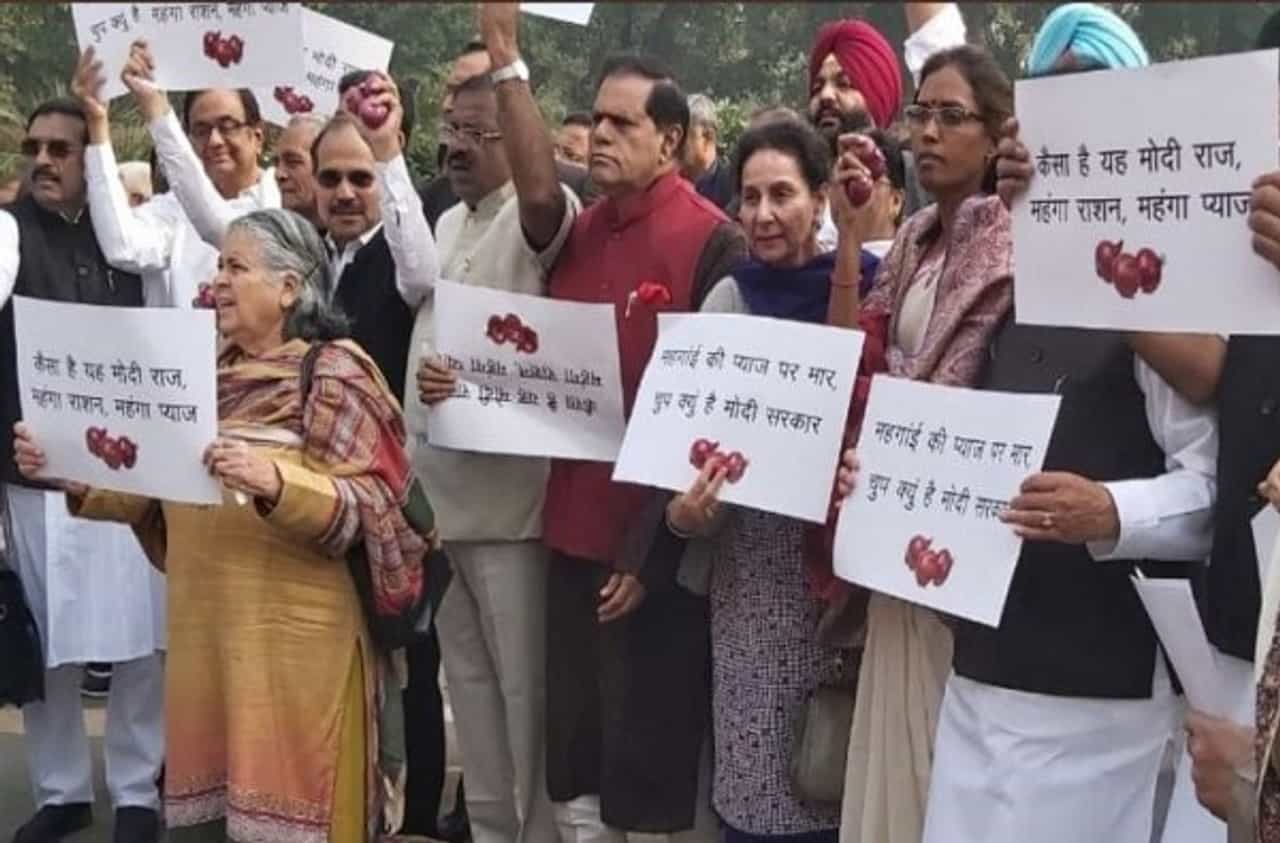 सरकारने कांद्याचे भाव कमी करावेत आणि गरिबांचा छळ करणं थांबवावं, अशी मागणी करणारे बॅनर लावून घोषणाबाजी केली आणि कांद्याच्या टोपली घेऊन काँग्रेसच्या खासदारांनी निषेध केला. ‘कैसा है यह मोदी राज, महंगा राशन, महंगा प्याज’, ‘महंगाई की प्याज पर मार, चूप क्यूं है मोदी सरकार’ अशी टीका बॅनरच्या माध्यमातून करण्यात आली.