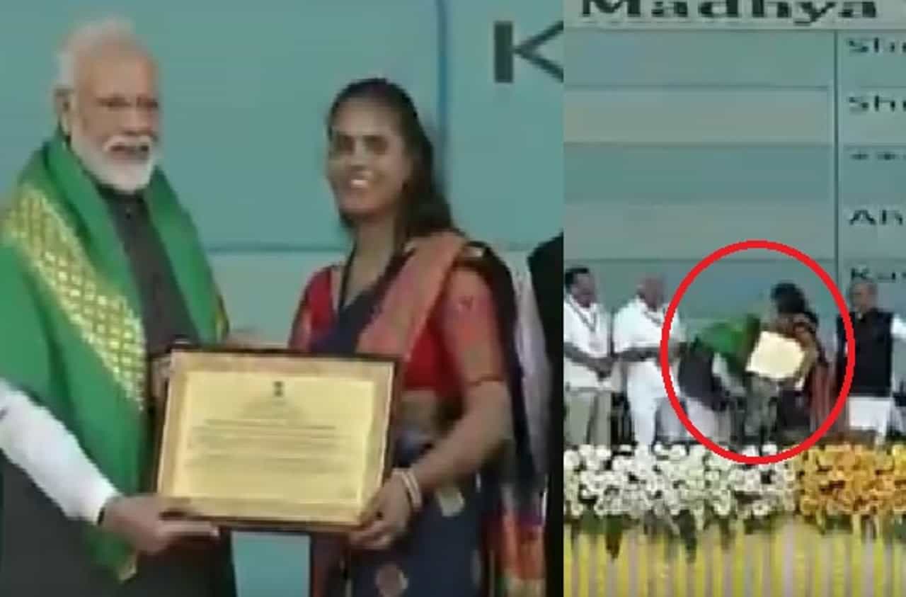 पुरस्कारासाठी नाव पुकारताच संबंधित महिला स्टेजवर आली. त्यावेळी नरेंद्र मोदींनी तिला हात जोडून नमस्कार केला. प्रशस्तिपत्रक देत मोदींच्या हस्ते तिचा सत्कार करण्यात आला. त्यानंतर सर्वसामान्यपणे जे होतं, तेच घडलं. सन्मानार्थी महिला मोदींच्या पाया पडायला गेली. तेव्हा नरेंद्र मोदींनी तिला अडवलं. इतक्यावर न थांबता, ते स्वत: तिच्या पाया पडण्यासाठी झुकले.