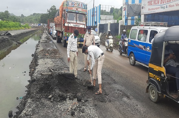 रस्त्यावरील खड्ड्यांमुळे वाहतूक कोंडी होत असल्याने वसईत पोलिसांनी हातात फावडे आणि घमेलं घेऊन खड्डे बुजविले (Police filled the potholes on the highway).