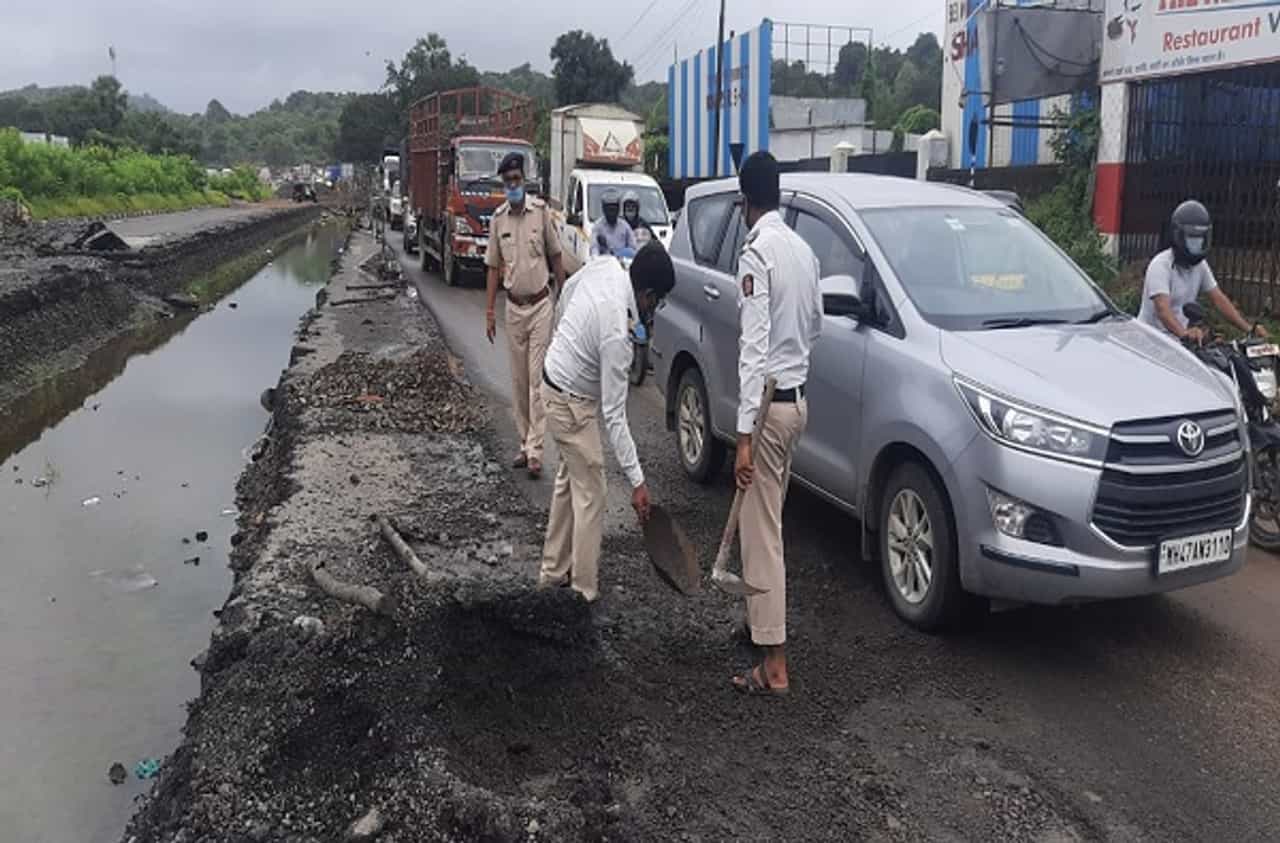 महामार्गावर आज सकाळी प्रचंड वाहतूक कोंडी निर्माण झाली. ही वाहतूक कोंडी काढण्यासाठी चिंचोटी महामार्ग केंद्राचे प्रभारी पोलीस उपनिरीक्षक नरेंद्र वडे यांच्या पुढाकारातून पोलीस नाईक शिवराज झांजुरने, अविनाश पानसरे,बाळासाहेब वने, बंडू पाटील, पोलीस हवालदार सुनील भालेराव या वर्दीतल्या पोलिसांनीच हातात फावडे आणि घमेलं घेऊन महामार्गावरील खड्डे बुजविले. या उपक्रमातून पोलिसांनी आपली सामाजिक बांधिलकी जपत वाहतूक सुरळीत केली.