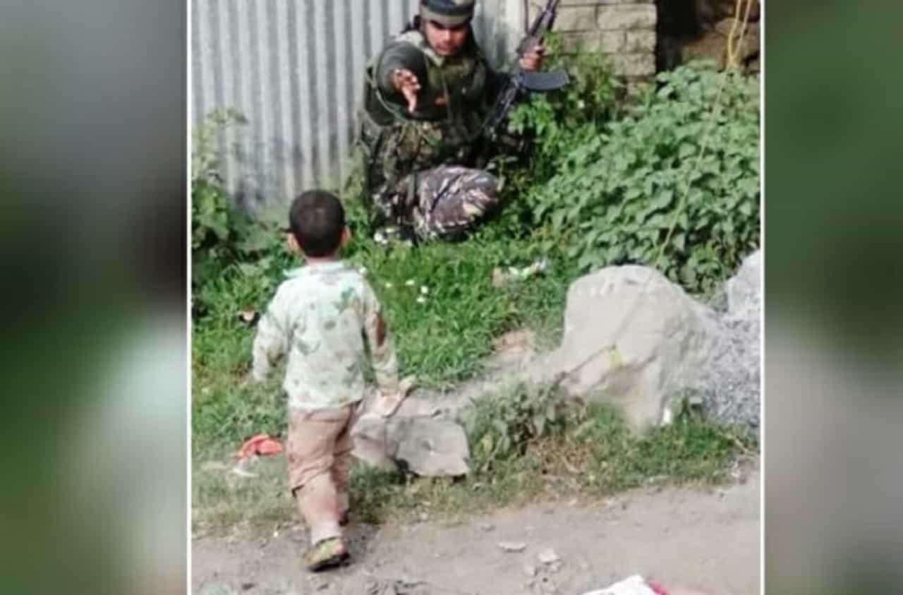 हे चित्र समोर असताना, बाजूला अतिरेक्यांवर निशाणा धरुन बसलेला भारताचा जवान, त्या चिमुकल्याला आपल्याकडे बोलावून घेत होता. नंतर जवानाने त्या चिमुकल्याला आपल्या कडेवर घेतलं.