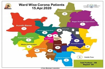 पुणे शहरातील पंधरा प्रभागांमधील 386 कोरोनाबाधित रुग्णांचा नकाशाच्या माध्यमातून लेखाजोखा घेण्यात आला आहे. 15 एप्रिलपर्यंत सापडलेल्या रुग्णांच्या वास्तव्यावरुन हा आढावा घेतला आहे.