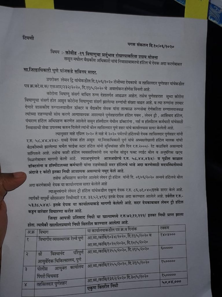 यात पुणे शहरातील हॉटेल पवन, लेमन ट्री, आर्शिवाद हॉटेल, पंचरत्न, हॉटेल सागर ही हॉटेल अधिग्रहण केले आहेत. यात ससून हॉस्पिटलसह सुमारे 80 खाजगी डॉक्टरची निवासाची सोय करण्यात आली आहे. त्यापैकी एका हॉटेलने 86 लाख ७१ हजार रुपयांचे बील जिल्हा प्रशासनाला सादर केले.