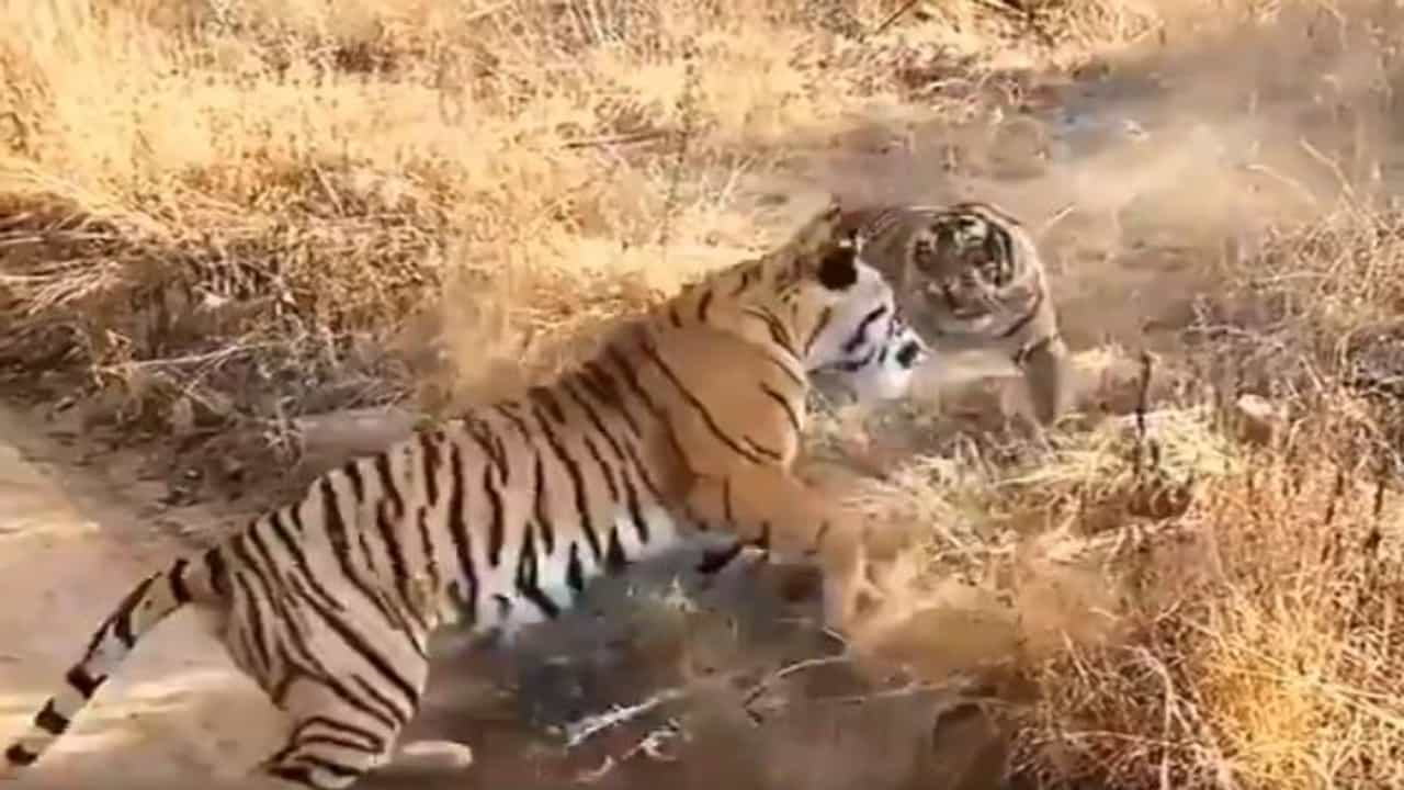 भारताच्या रणथंबोर अभयारण्यातील हा व्हिडीओ आहे. या व्हिडीओत सुरुवातीला दोन वाघ एकमेकांवर गुरगुरताना आणि एकमेकांचा अंदाज घेताना दिसत आहेत. 12 सेकंदांच्या या व्हिडीओत दोन्ही वाघ एकमेकांवर त्वेषाने हल्ला करत आहेत. त्यांच्या डरकाळ्यांनी जंगलाचा परिसर अक्षरश: दणाणून गेला आहे.