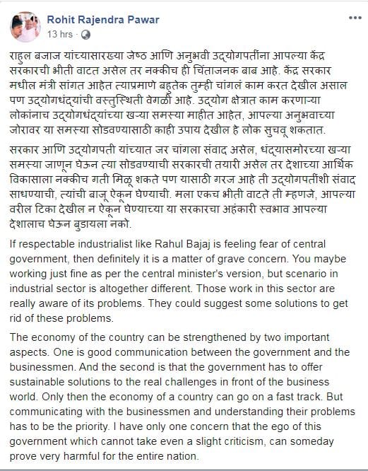 ‘राहुल बजाज यांच्यासारख्या ज्येष्ठ आणि अनुभवी उद्योगपतींना आपल्या केंद्र सरकारची भीती वाटत असेल तर नक्कीच ही चिंताजनक बाब आहे. केंद्र सरकार मधील मंत्री सांगत आहेत त्याप्रमाणे बहुतेक तुम्ही चांगलं काम करत देखील असाल पण उद्योगधंद्यांची वस्तुस्थिती वेगळी आहे. उद्योग क्षेत्रात काम करणाऱ्या लोकांनाच उद्योगधंद्यांच्या खऱ्या समस्या माहीत आहेत, आपल्या अनुभवाच्या जोरावर या समस्या सोडवण्यासाठी काही उपाय देखील हे लोक सुचवू शकतात.’ असं रोहित पवारांनी लिहिलं आहे.