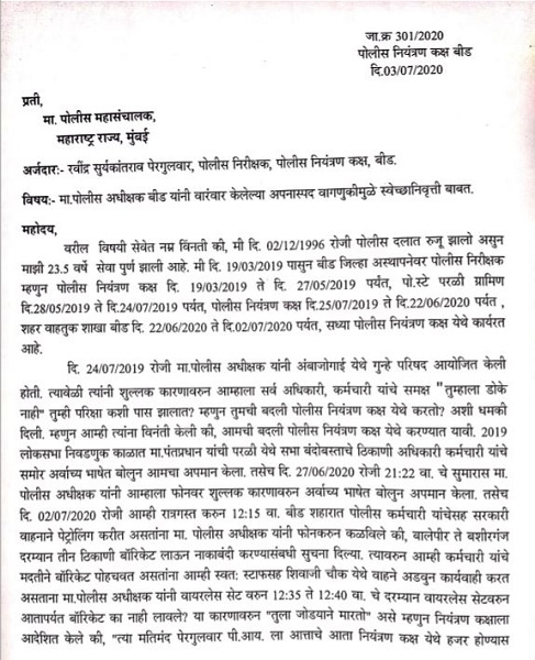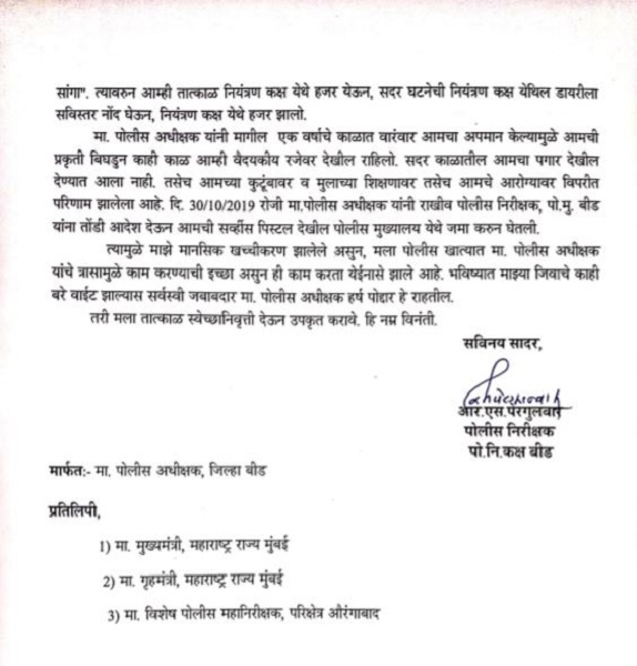 पोलीस निरीक्षक रविंद्र पेरगुलवार हे 19 मार्च 2019 रोजी बीड जिल्ह्यात तैनात झाले. आतापर्यंत त्यांनी परळी ग्रामीण, बीड वाहतूक शाखा आणि पोलीस नियंत्रण कक्षात कर्तव्य बजावले. मात्र गेल्या वर्षभरापासून पोलीस अधीक्षक हर्ष पोद्दार हे अपमानास्पद वागणूक देत असल्याचा आरोप पेरगुलवार यांनी केला आहे. “तुम्हाला डोके नाही, तुम्ही परीक्षा कसे पास झालात, तुला जोड्याने मारतो” अशा अभद्र शब्दात पोलीस अधीक्षक पोद्दार यांनी अपमानित केल्याचाही आरोप पेरगुलवार यांनी केला.
