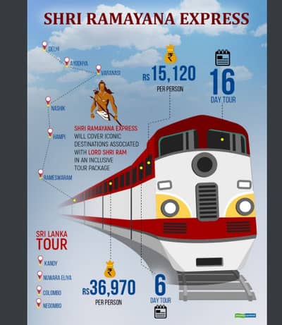 Retracing the Epic Journey of Lord Rama: Indian Railways to introduce a special tourist train ‘Shri Ramayana Express’ which will cover all the places from Ayodhya to Colombo via Rameshwaram, on the Ramayana circuit.https://t.co/WR9HIYl0ae pic.twitter.com/jcGKeiBz12
