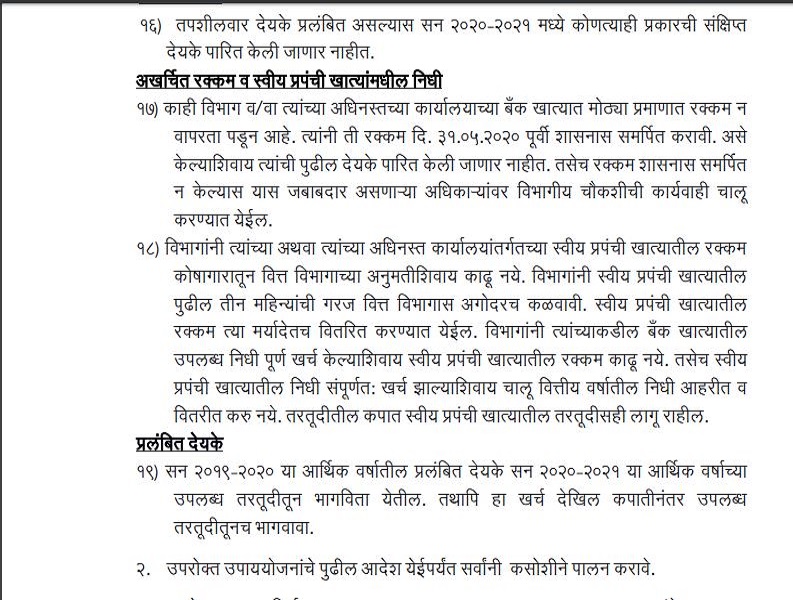 या अखर्चिक निधीचा शोध घेण्यासाठी राज्य सरकारने 31 मेच्या मुदतीचा अध्यादेश जारी करत, सर्व विभागांना आढावा घेण्यास सांगितलं आहे. हा अखर्चिक निधी राज्यातील सर्व खात्यांमधील तालुका, जिल्हा, विभागीय निमशासकीय कार्यालयाच्या बँकेत सरासरी 1 लाख कोटीपेक्षा जास्त असल्याचे उघड होतं आहे. त्यामुळे कोरोनाच्या आर्थिक संकटात राज्य सरकार अखर्चिक निधीतून मार्ग काढताना दिसत आहे.
