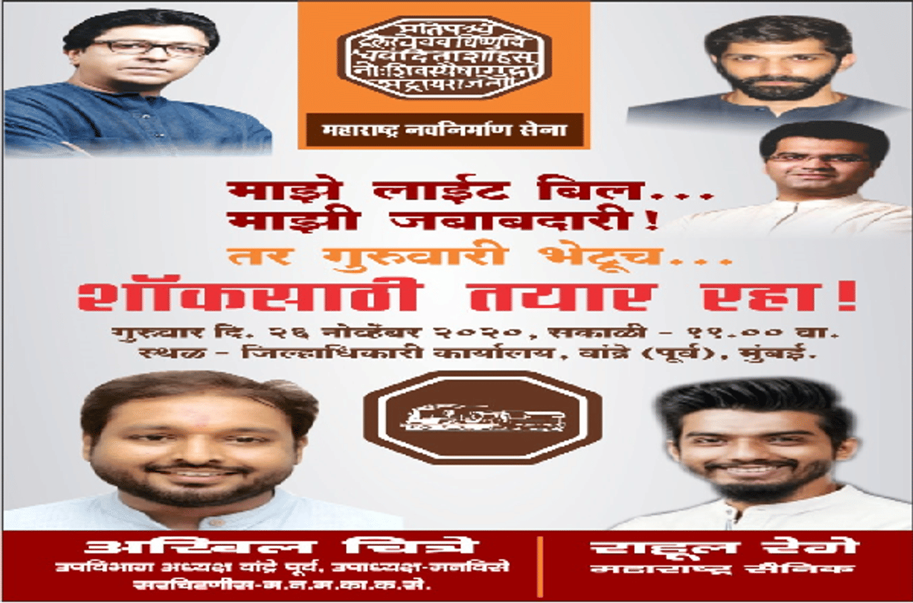 वाढीव वीजबिलाविरोधात मनसेने मुंबईमध्ये गुरुवारी (26 नोव्हेंबर) मोर्चाचे आयोजन केले आहे. त्यासाठी मनसेने खास तयारी सुरु केली आहे. मनसेने वातावरण निर्मितीस सुरुवात केली आहे. त्यासाठी मनसेकडून शहरात ठिकठिकाणी बॅनर, होर्डिंग्ज लावण्यात येत आहेत. विषेश म्हणजे मनसेकडून मुख्यमंत्री उद्धव ठाकरे यांच्या मातोश्री या निवासस्थानाच्या परिसरातदेखील बॅनर लावण्यात आले आहेत. या पोस्टर्समद्ये वीजबिल न आलेल्या मंत्र्यांना लक्ष्य करण्यात आलं आहे.