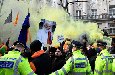 या आंदोलकांनी फलक झळकावत आणि घोषणाबाजी करत मोदी सरकारच्या कृषी कायद्यांचा निषेध केला. या आंदोलनामुळे सेंट्रल लंडनच्या परिसरात मोठी वाहतूक कोंडी निर्माण झाली. त्यानंतर पोलिसांनी कोव्हिडच्या पार्श्वभूमीवर लागू करण्यात आलेल्या नियमांचे उल्लंघन केल्याप्रकरणी काही आंदोलकांना ताब्यात घेतले.