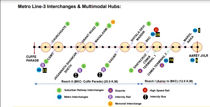 कफ परेड, विधान भवन, चर्चगेट मेट्रो, हुतात्मा चौक, छत्रपती शिवाजी महाराज टर्मिनस मेट्रो, काळबादेवी, गिरगाव, ग्रॅंड रोड मेट्रो, जगन्नाथ शंकरशेठ मेट्रो, महालक्ष्मी मेट्रो, सायन्स सेंटर, आचार्य अत्रे चौक, वरळी, सिद्धिविनायक, दादर मेट्रो, शितलादेवी मंदिर, धारावी, बीकेसी, वांद्रे कॉलनी, सांताक्रुझ मेट्रो, एअर पोर्ट टर्मिनल-1, सहार रोड, एअर पोर्ट टर्मिनल-2, मरोळ नाका, एमआयडीसी- अंधेरी, सिप्झ, आरे जेव्हीएलआर.