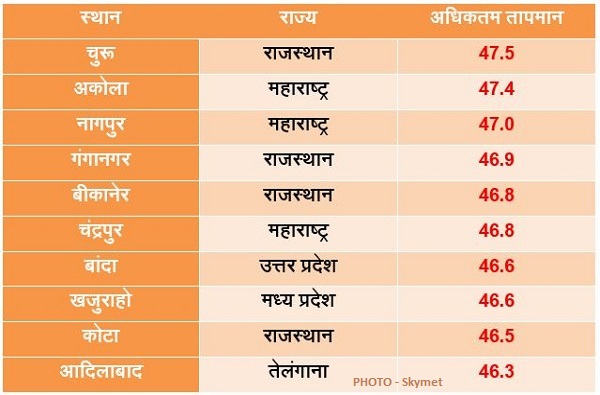 टॉप टेन ‘हॉट’ शहरांमध्ये दुसऱ्या क्रमांकावर अकोला (47.4), तिसऱ्या क्रमांकावर नागपूर (47.0) तर चंद्रपूर (46.8) सहाव्या क्रमांकावर आहे. महाराष्ट्रातल ही तीन शहरं देशात टॉप टेन सर्वाधिक तापमानाच्या यादीत आहेत.
