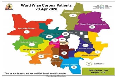 पुणे शहरात 29 एप्रिलपर्यंत 1444 कोरोनाग्रस्त रुग्ण आढळल्याची नोंद महापालिकेकडे आहे. पुणे शहरातील एकूण रुग्णांपैकी 1335 रुग्णांचा प्रभागनिहाय आढावा नकाशाच्या माध्यमातून घेण्यात आला आहे.