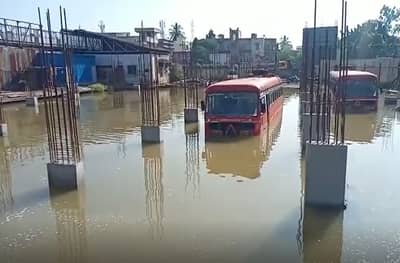 पाण्यातून रस्ता शोधत बसेसमध्ये बसण्यासाठी प्रवाशांना वाट काढावी लागत आहे.