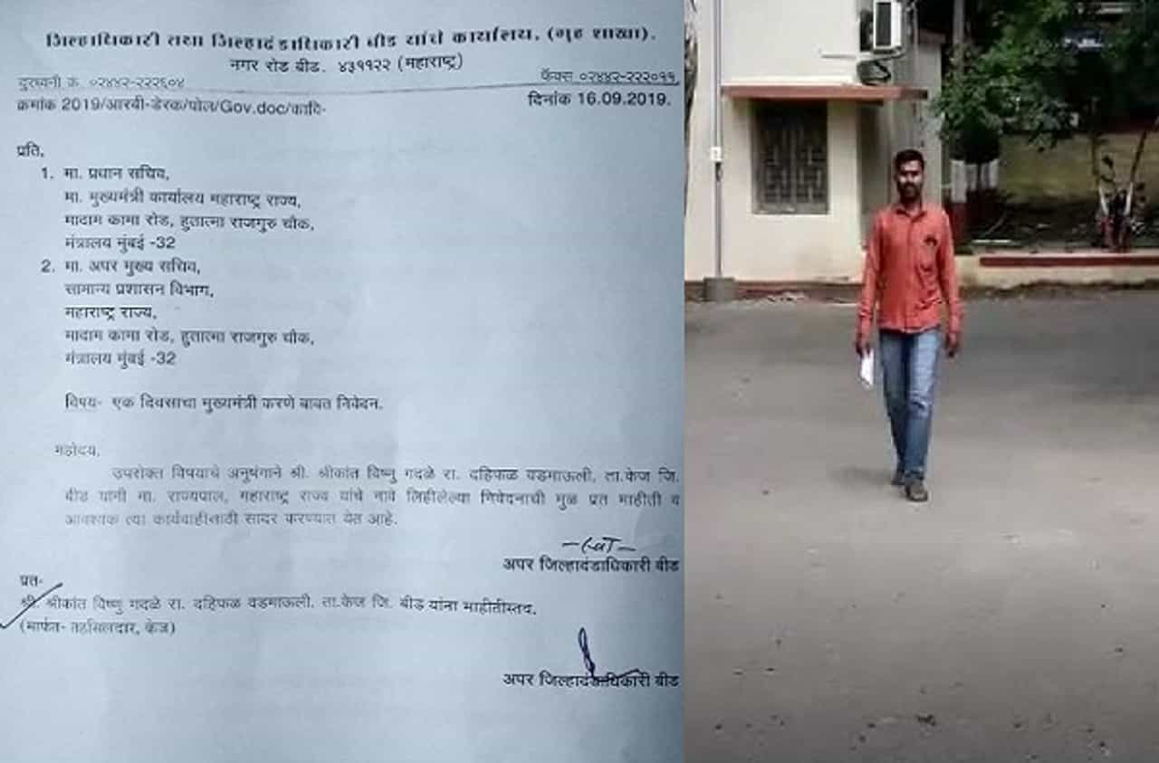 मराठवाड्यातील प्रश्न सोडवण्यासाठी मला एक दिवसाचा मुख्यमंत्री करा असं या तरुणाने पत्रात म्हटलं आहे. हा तरुण मूळचा बीड जिल्ह्यातील आहे.