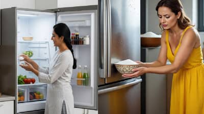 फ्रिजमधील वास आणि ओलावा दूर करण्यासाठी, तुम्ही एका लहान वाटीत किंवा उघड्या छोट्या कंटेनरमध्ये 100 ते 150 ग्रॅम जाड मीठ भरून फ्रिजच्या एका कोपऱ्यात ठेवू शकता. ओलावा शोषल्यानंतर मिठाचा प्रभाव कमी होतो, म्हणून दर 15-20 दिवसांनी ते बदलणे आवश्यक आहे. जर तुम्हाला मीठ वापरायचे नसेल तर त्याच्या जागी बेकिंग सोडा देखील वापरता येईल. एका वाटीत बेकिंग सोडा भरून फ्रिजमध्ये ठेवल्यानेही वास कमी होतो. त्यामुळे तुम्ही देखील हा उपाय नक्कीच करून पाहू शकता.