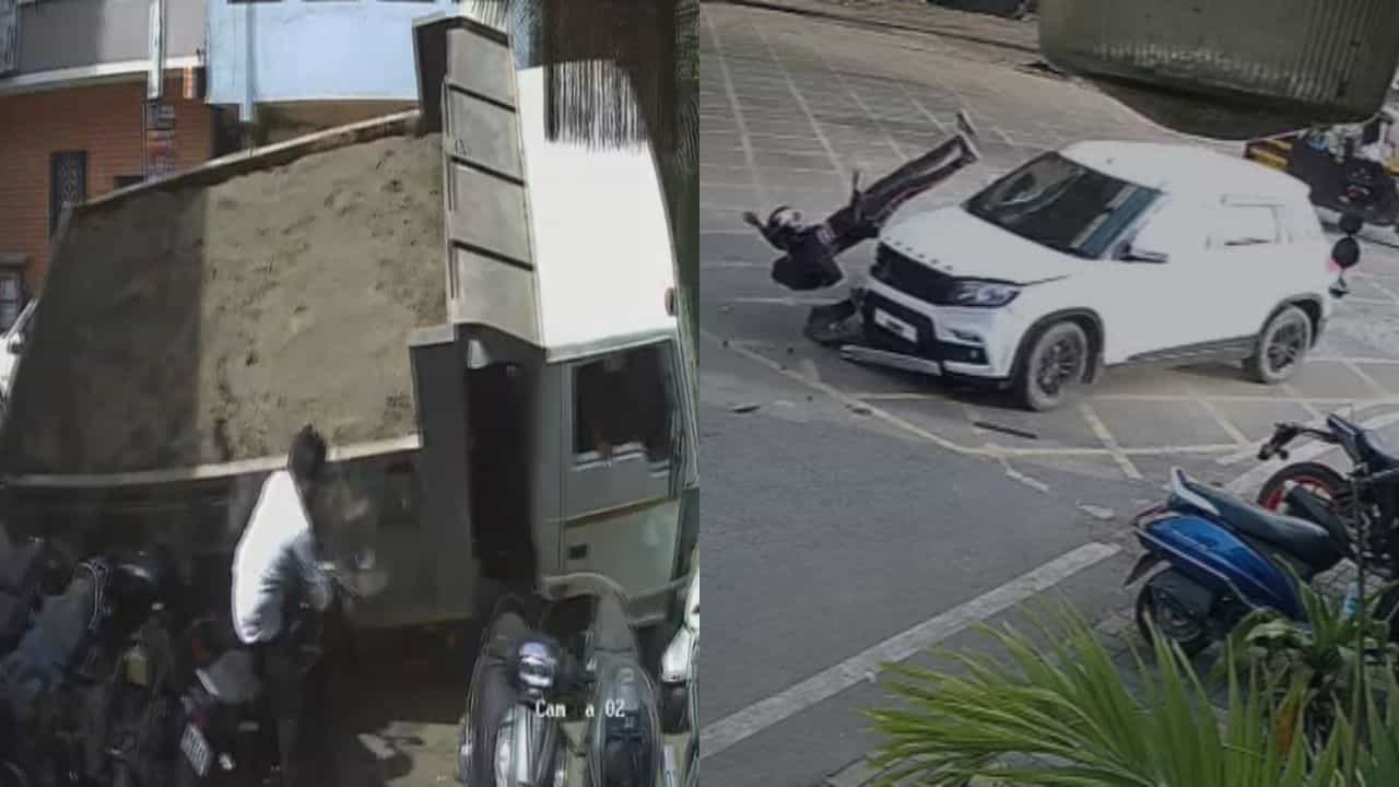 दुसऱ्या अपघातात एक वाळूचा डंपर उलटल्याचे दिसत आहे. हा डंपर रस्त्यावरून जात होता. त्यावेळी एक व्यक्ती रस्त्याच्या कडेला दुचाकीजवळ उभा होता. मात्र वाळूची वाहतूक करणाऱ्या या डंपरचे चाक खड्ड्यात अडकले अन डंपर पलटी झाला.हे पाहून दुचाकीस्वाराने गाडी सोडून धाव घेतली. त्याने प्रसंगावधान दाखवल्यानं तो यातून थोडक्यात बचावला. नंतर चालक आणि क्लिनर खिडकीतून खाली उतरल्याचे दिसत आहे. या घटनेचाही सीसीटीव्ही व्हिडिओ समोर आला आहे.