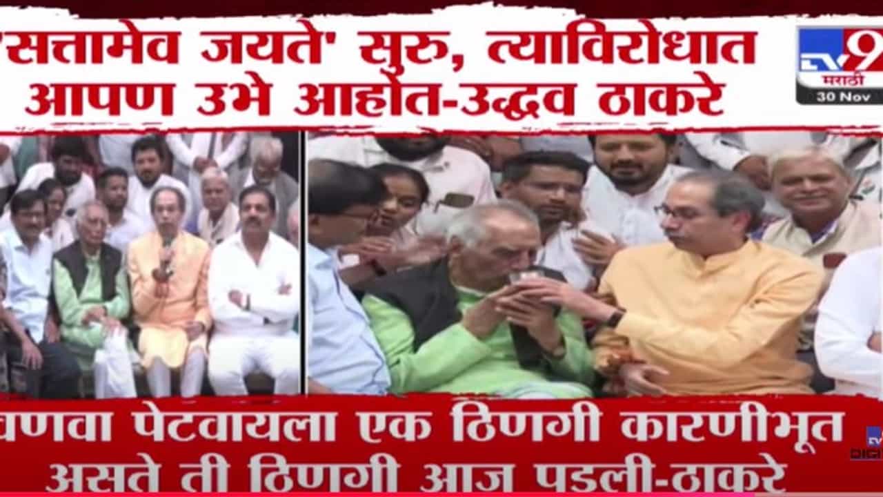 उद्धव ठाकरे यांनी राज्यात एवढे राक्षसी मतदान होऊनही कुठेच जल्लोष किंवा उत्साह दिसत नाही. आता सत्येमेव जयते नाही तर सत्ता मेव जयते सुरु आहे. त्यामुळे या निकालाने राज्यातील जनता आनंदी झाल्याचे दिसत नाही. मतदाराला आपले मत नेमके कोणाला जाते हे जाणण्याचा प्रत्येक नागरिकाला अधिकार आहे. केवळ पावतीवर चिन्ह दिसले हे पुरसे नाही. जर फेरमतदानाची मागणी केली तर लागलीच मान्य झाली पाहीजे अशी मागणी केली. तसेच इलेक्शन कमिशन विरोधला हा लढा असाच महाविकास आघाडी सुरु ठेवणार असल्याचे उद्धव ठाकरे यांनी सांगितले. बाबा आढाव यांचे वय ९४ वर्षे त्यांना आपण प्रथमच भेटत आहोत. ते म्हातारपण मान्य करत नाहीत आम्हाला त्यांचा आशीवार्द मिळाला आहे. त्यांनी उपोषण सोडावे त्यांचा लढा महाविकास आघाडी पुढे सुरु ठेवेले असे सांगत उद्धव ठाकरे यांना आढाव यांना पाणी प्यायला देत हे उपोषण सोडवले.