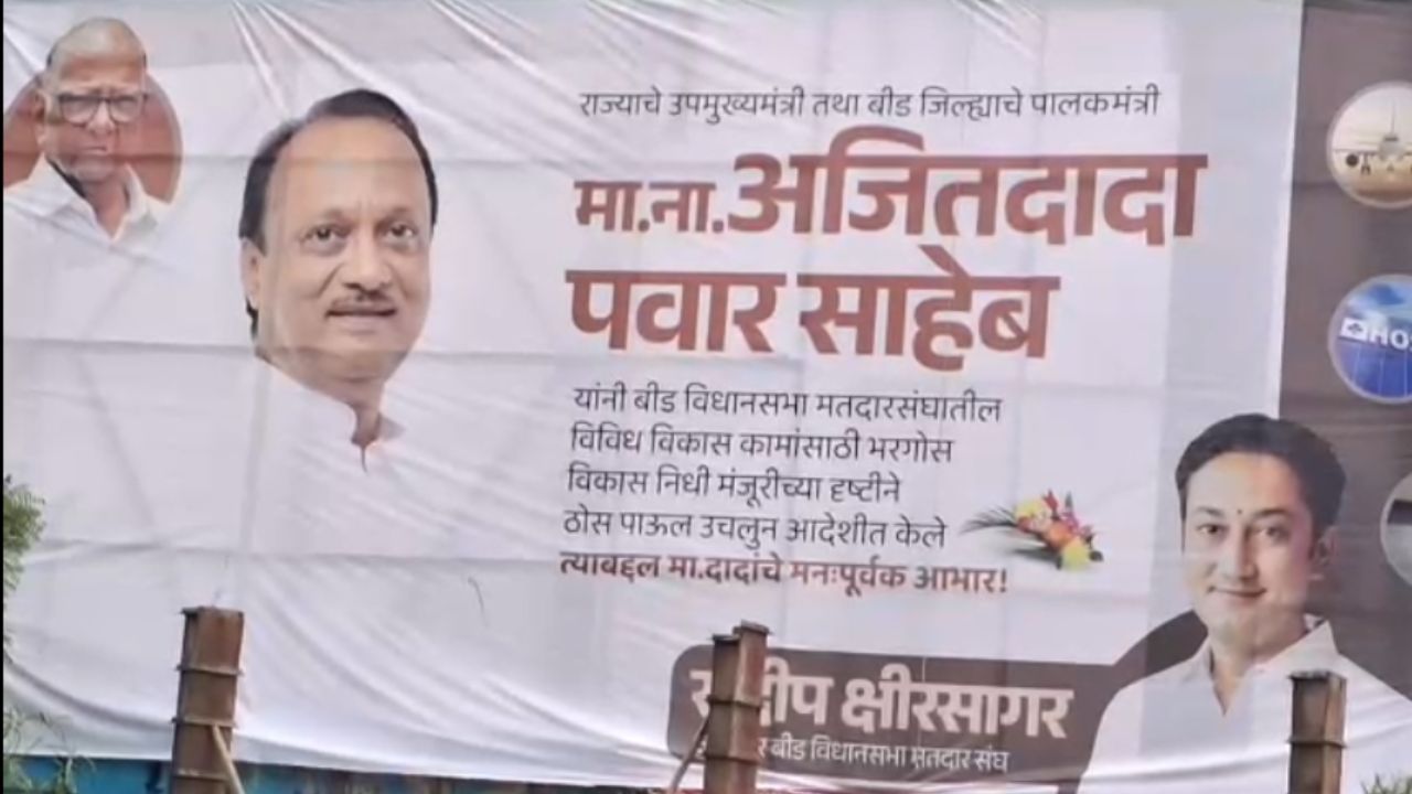सध्या बीड जिल्ह्यात राष्ट्रवादी अजित पवार गटाचे तीन आमदार आहे. परंतु शरद पवार गटाचे संदीप क्षीरसागर हे एकमेव आमदार आहेत. त्यांच्याकडून अजित पवार यांचा फोटो लावून बीडमध्ये बॅनर लावले. त्यामुळे दोन्ही राष्ट्रवादी एकत्र येणार का? अशी चर्चा सुरु झाली. कारण त्यांच्या बॅनरवर शरद पवार आणि अजित पवार या दोन्ही नेत्यांचे फोटो आहेत. त्या बॅनरवर म्हटले आहे की, अजित पवार साहेब यांनी बीड मतदार संघातील विविध विकास कामांसाठी भरघोस विकास निधी मंजूर करण्यासाठी ठोस पाऊल उचलले. त्याबद्दल दादांचे मन:पूर्वक आभार.