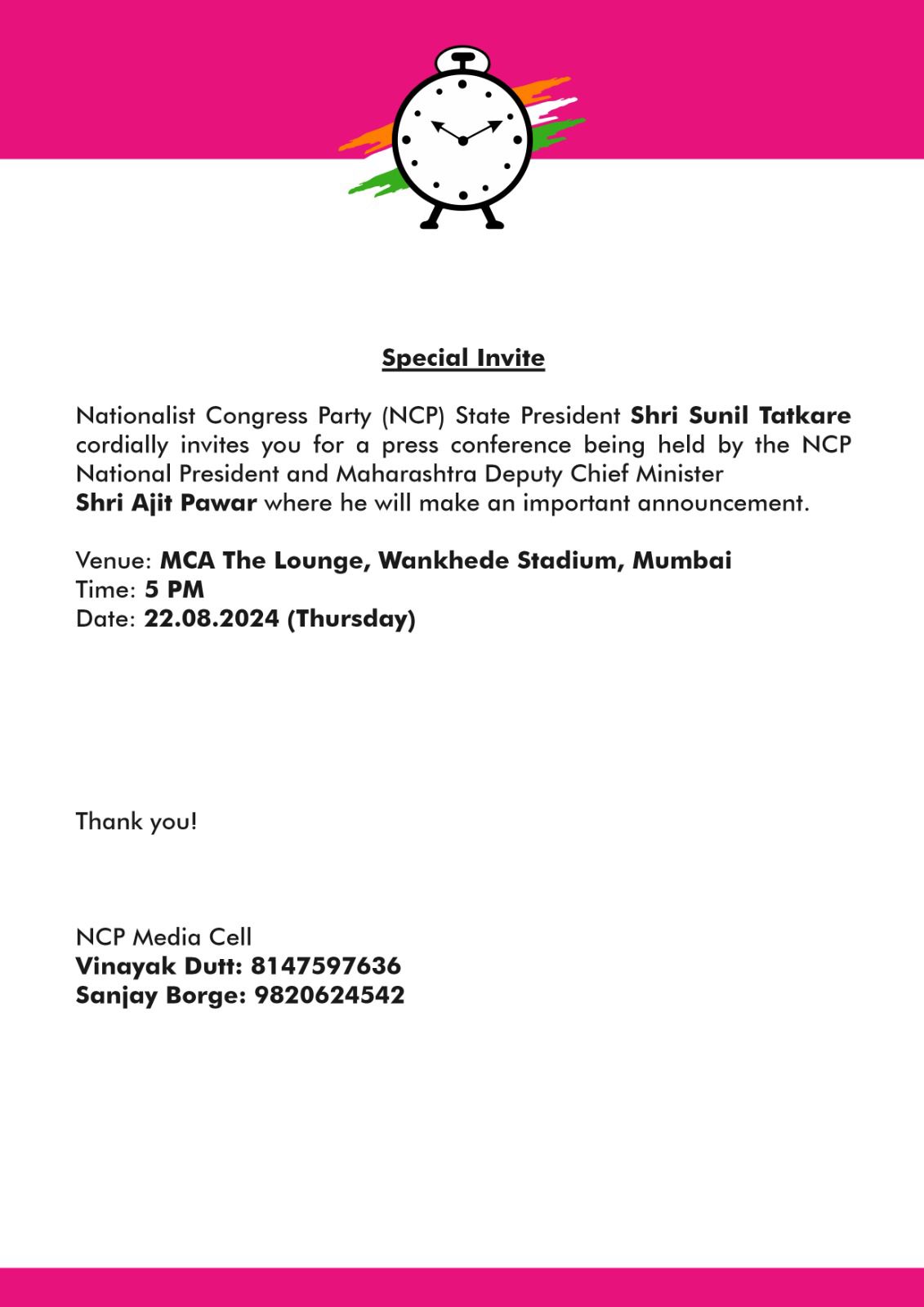 महाराष्ट्राच्या राजकारणातील एक महत्त्वाची बातमी समोर येत आहे. उपमुख्यमंत्री अजित पवार यांनी उद्या संध्याकाळी 5 वाजता मुंबईत पत्रकार परिषद बोलावली आहे. अजित पवार उद्याच्या पत्रकार परिषदेत मोठी घोषणा करण्याची शक्यता आहे. एमसीएच्या वानखेडे लाँच येथे उद्या ही पत्रकार परिषद होणार आहे. उपमुख्यमंत्री अजित पवार हे त्यांच्या तापट स्वभावामुळे ओळखले जातात. विधानसभेच्या 2019 च्या निवडणुकीनंतर महाविकास आघाडीचं सरकार स्थापनेसाठी जवळपास संपूर्ण हालचाली पूर्ण झाल्या होत्या. ज्या दिवशी शिवसेना, राष्ट्रवादी काँग्रेस आणि काँग्रेस हे सरकार स्थापनेचा दावा करण्यासाठी राज्यपालांकडे जाणार होते त्याचदिवशी पहाटे अजित पवार यांनी भाजपसोबत पहाटेचा शपथविधी उरकला होता. पण हे सरकार 36 तासांच्या आत कोसळलं होतं. हेही असे की थोडे अजित पवार यांनी वर्षभरापूर्वी अचानक तडकाफडकी महायुतीत जाण्याचा निर्णय घेतला. त्यांच्या बंडामुळे राष्ट्रवादी काँग्रेस पक्षात फूट पडली. पण आता महायुतीत काही ठिकाणी विधानसभेच्या जागावाटपाच्या पार्श्वभूमीवर खटके उडताना दिसत आहेत. या सर्व घडामोडी पाहता अजित पवार यांनी अचानक उद्या बोलावलेल्या पत्रकार परिषदेतेला जास्त महत्त्व प्राप्त झालं आहे.