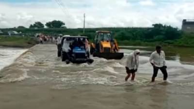 मिळालेल्या माहितीनुसार सिल्लोड जिल्ह्याातील आमठाण परिसरात एका माणासाचा मृत्यू झाला. मागील दोन दिवसांपासून औरंगाबादेत मुसळधार पाऊस बरसतोय. या पावसामुळे पुर्णा नदी दुथडी भरून वाहत आहे. तर दुसरीकडे या नदीवरील पुलाचे कामही झालेले नाही. त्याचा फटका येथील लोकांना बसत आहे. या परिसरात एका मणासाचा मृत्यू झाल्यामुळे त्याला गावात अंत्यसंस्कारासाठी आणायचे होते. मात्र पुलाचे बांधकाम न झाल्यामुळे मृतदेहाची वाहतूक करण्यासाठी गावकऱ्यांना थेट ट्रॅक्टर आणि जेसीबीच्या मदत घ्यावी लागली. आधीच नदीवरील पुलाचे बांधकाम झालेले नाही. त्यातही नदीला पूर आल्यामुळे नागरिकांना मृतदेहावर अंत्यसंकस्कार करण्यासाठी हे पाऊल उचलावे लागले.