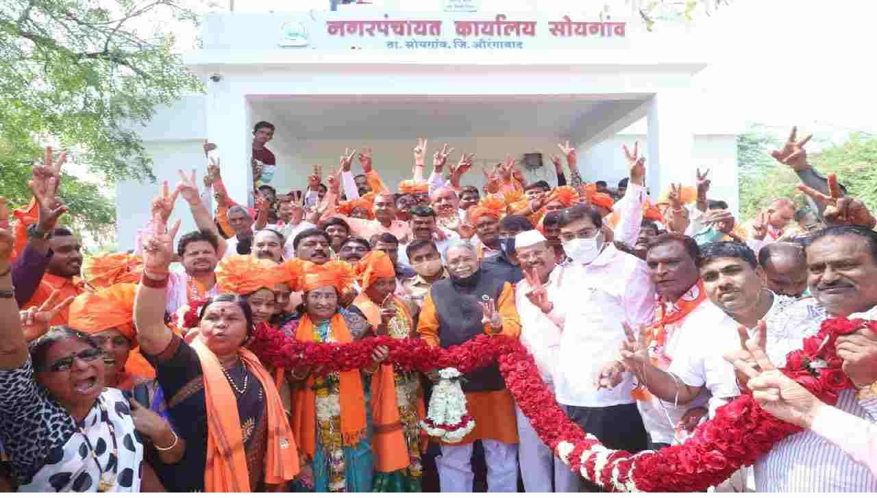 सोयगाव नगर पंचायत निवडणुकीत निवडणुकीत 17 पैकी 11 जागेवर शिवसेनेने विजय मिळवीत स्पष्ट बहुमत मिळविले होते. भाजपच्या ताब्यातील ही नगर पंचायत आपल्या ताब्यात घेऊन राज्यमंत्री सत्तार यांनी भाजपचे केंद्रीय रेल्वे राज्यमंत्री रावसाहेब दानवे यांना जोरदार धक्का दिला होता. त्यानंतर गटनेता पदाच्या निवडणूकीच्या वेळी सुद्धा भाजपचे 6 पैकी 4 नगरसेवक शिवसेनेत खेचून आणत त्यांनी पुन्हा दुसऱ्यांदा धक्का दिला. या निवडीच्या वेळी नगराध्यक्ष पदासाठी भाजपला सूचक व अनुमोदन न मिळाल्याने ते अध्यक्ष पदासाठी अर्ज देखील करू शकले नसल्याने भाजपला सोयगाव मध्ये मोठी नामुष्कीला सामोरे जावे लागले आहे. यावेळी सोयगाव नगर पंचायतीमधील भाजपचे ६ पैकी ४ नगरसेवक शिवसेनेत आले असून आता उर्वरित दोघेही लवकरच शिवसेनेत प्रवेश करणार आहे अशी माहिती देत सोयगाव मधून भाजप भुईसपाट होईल असे चंद्रकांत खैरे म्हणाले.